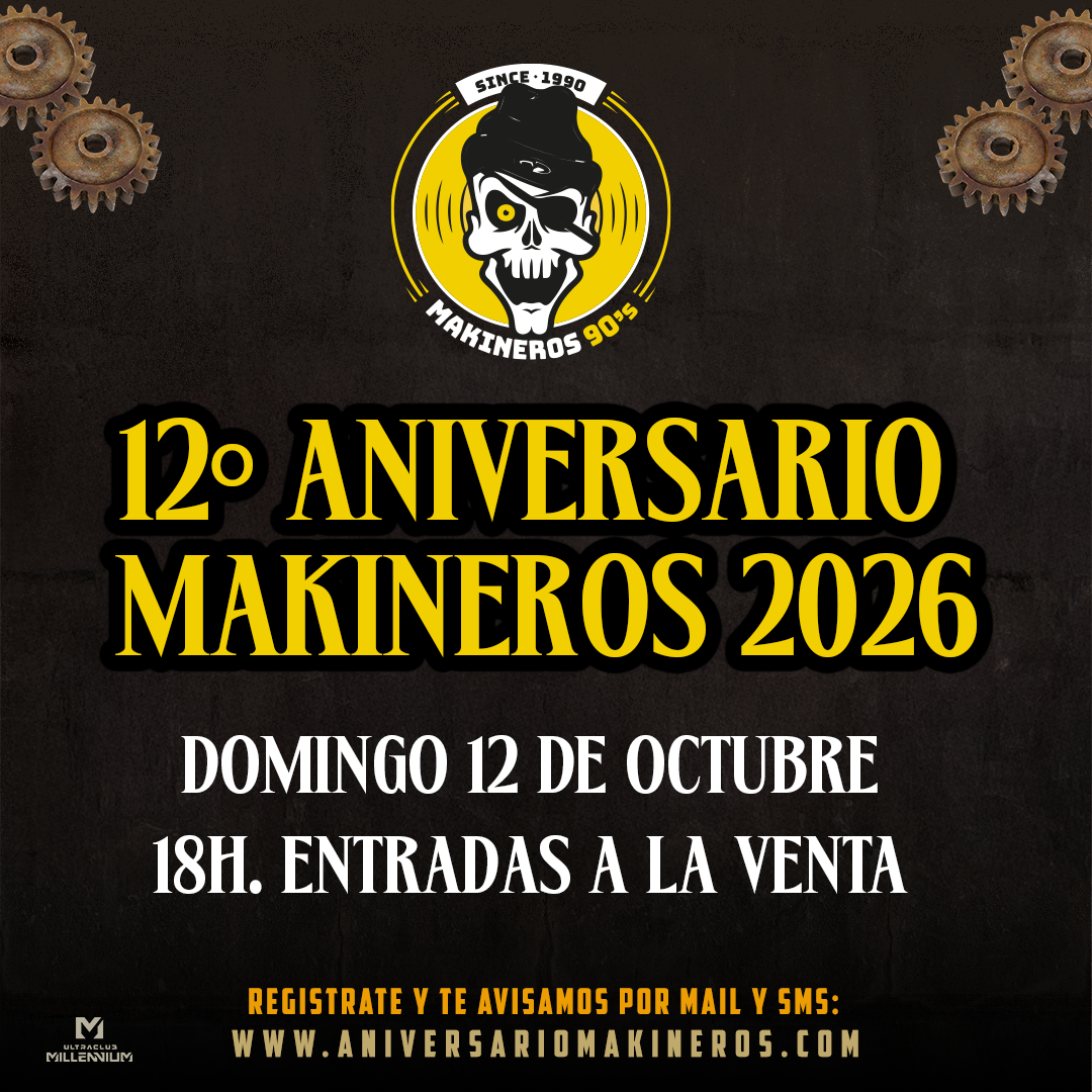 Llega el 12º Aniversario Makineros en Febrero de 2026 ¡Un aniversario de alta presión! como siempre celebrandose en Febrero de 2026 en la discoteca Millennium Ultraclub de Sils, Girona. Las entradas estarán disponibles este Domingo día 12 de Octubre en la web: www.AniversarioMakineros.com donde también